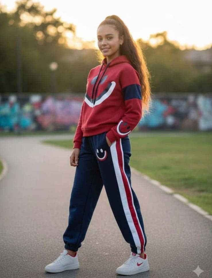 طقم رياضي نسائي عصري يوفر راحة وأناقة في نفس الوقت تصميم شبابي مناسب للرياضة والخرجات اليومية وخفيف وسهل في الارتداء مكون من هودي مريح وبنطال رياضي بقصة عملية تناسب الحركة طوال اليوم